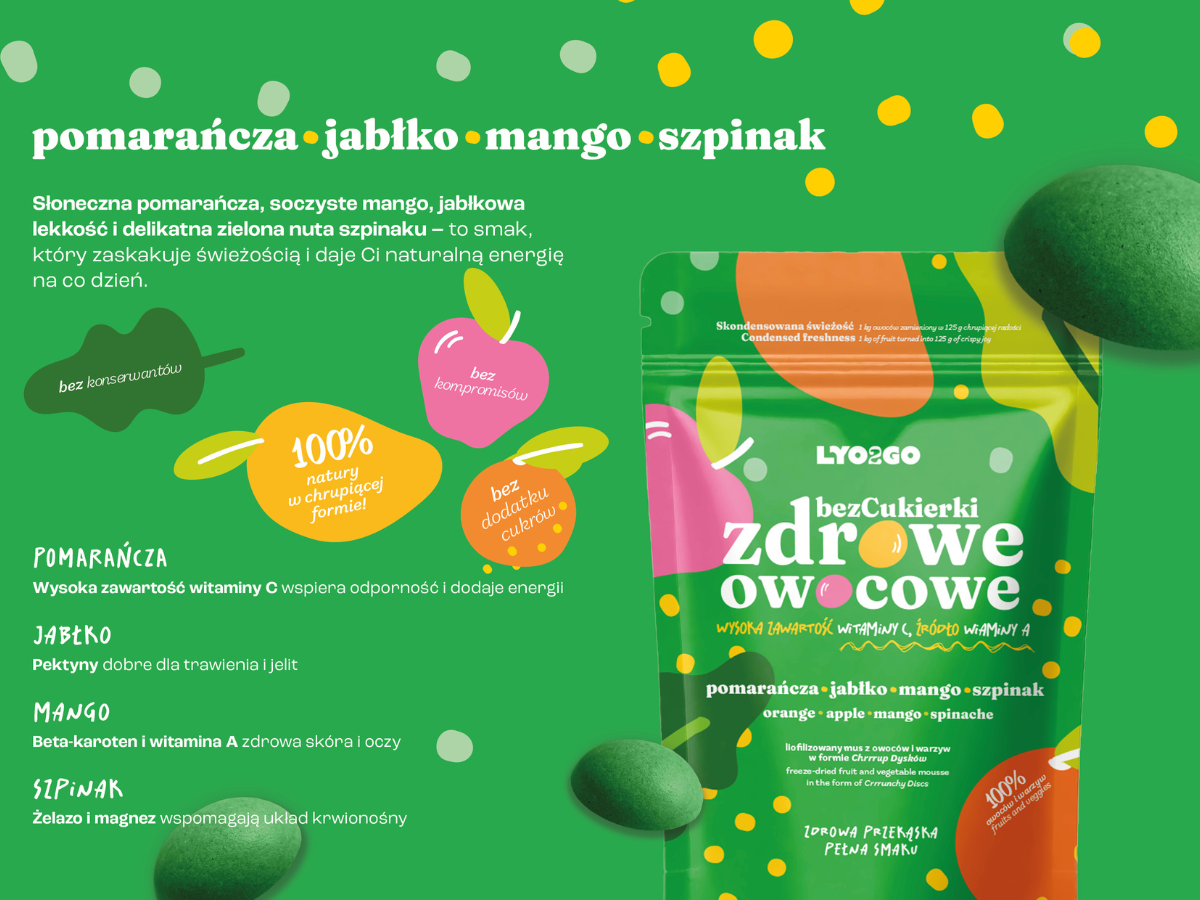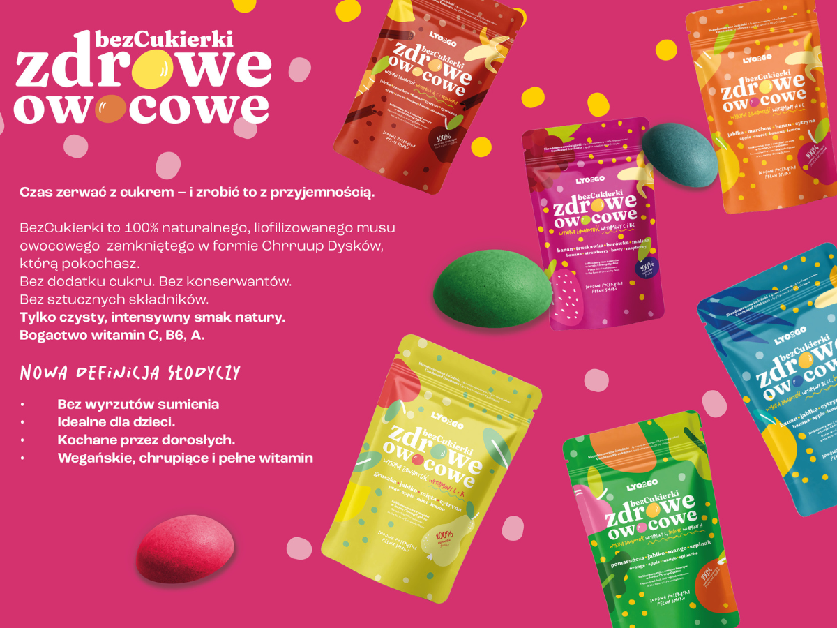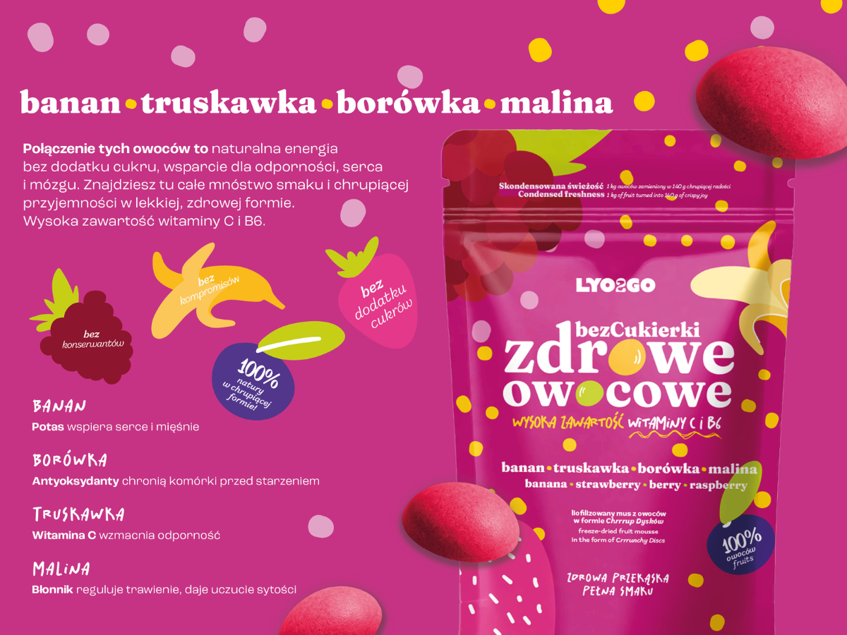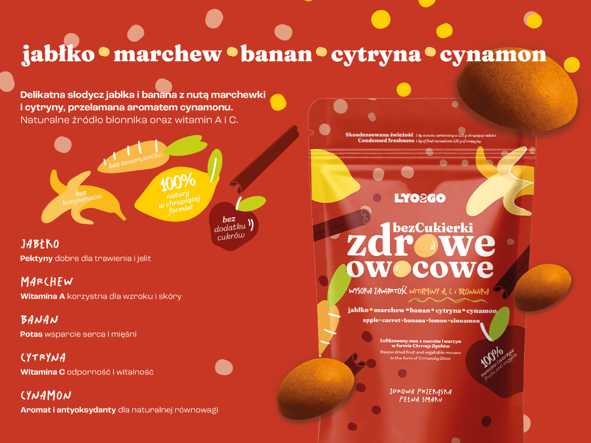 Nasze zdrowe owocowe bezCukierki to idealna przekąska dla każdego, kto szuka naturalnej słodyczy bez kompromisów! Liofilizowany mus ze 100% owoców, warzyw i ziół - zamknięty w formie Chrrrup Dysków – zachowują pełnię smaku, witamin i wartości odżywczych. BezCukierki LYO2GO to doskonały zamiennik tradycyjnych słodyczy. Sprawdzą się jako szybka, zdrowa przekąska, dodatek do lunchboxa lub naturalny sposób na zaspokojenie ochoty na „coś słodkiego” — bez wyrzutów sumienia.