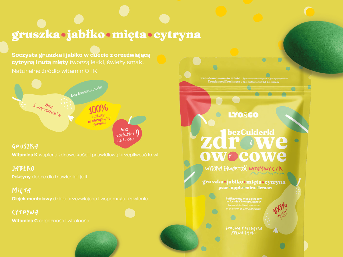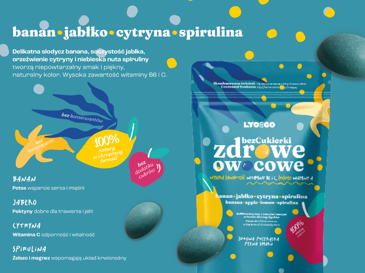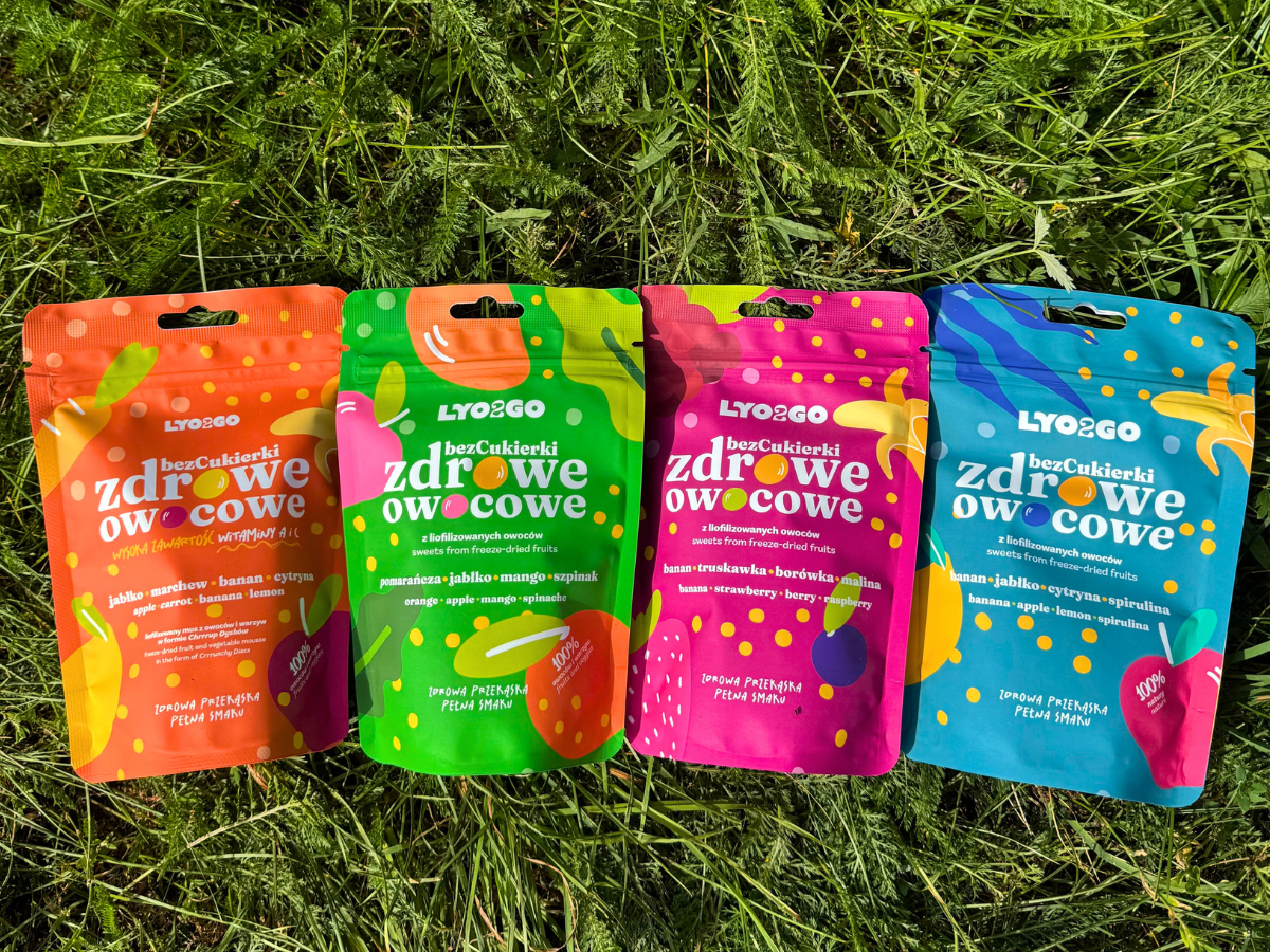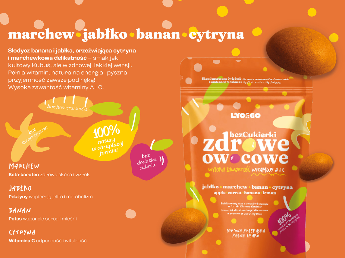 Nasze zdrowe owocowe bezCukierki to idealna przekąska dla każdego, kto szuka naturalnej słodyczy bez kompromisów! Liofilizowany mus ze 100% owoców, warzyw i ziół - zamknięty w formie Chrrrup Dysków – zachowują pełnię smaku, witamin i wartości odżywczych. BezCukierki LYO2GO to doskonały zamiennik tradycyjnych słodyczy. Sprawdzą się jako szybka, zdrowa przekąska, dodatek do lunchboxa lub naturalny sposób na zaspokojenie ochoty na „coś słodkiego” — bez wyrzutów sumienia.
