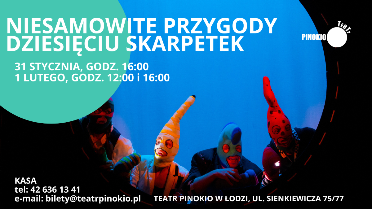 Spektakl "Niesamowite przygody dziesięciu skarpetek" przeniesie widzów Teatru Pinokio w Łodzi nie w jeden, ale w dziesięć światów – stworzonych przede wszystkim dzięki wyjątkowej sile nieskrępowanej wyobraźni. Scenariusz rozpisany „na pięciu aktorów, dziesięć rąk, dziesięć nóg” to odrobina kryminału, bajka z morałem i taka ze szczęśliwym zakończeniem. Wskakując ze skarpetkami w dziurę znajdującą się pod pralką, wybierzemy się w tajemniczą i zaskakującą podróż, a po drodze odkryjemy odpowiedź na pytanie, nad którym cały świat głowi się od zawsze…
