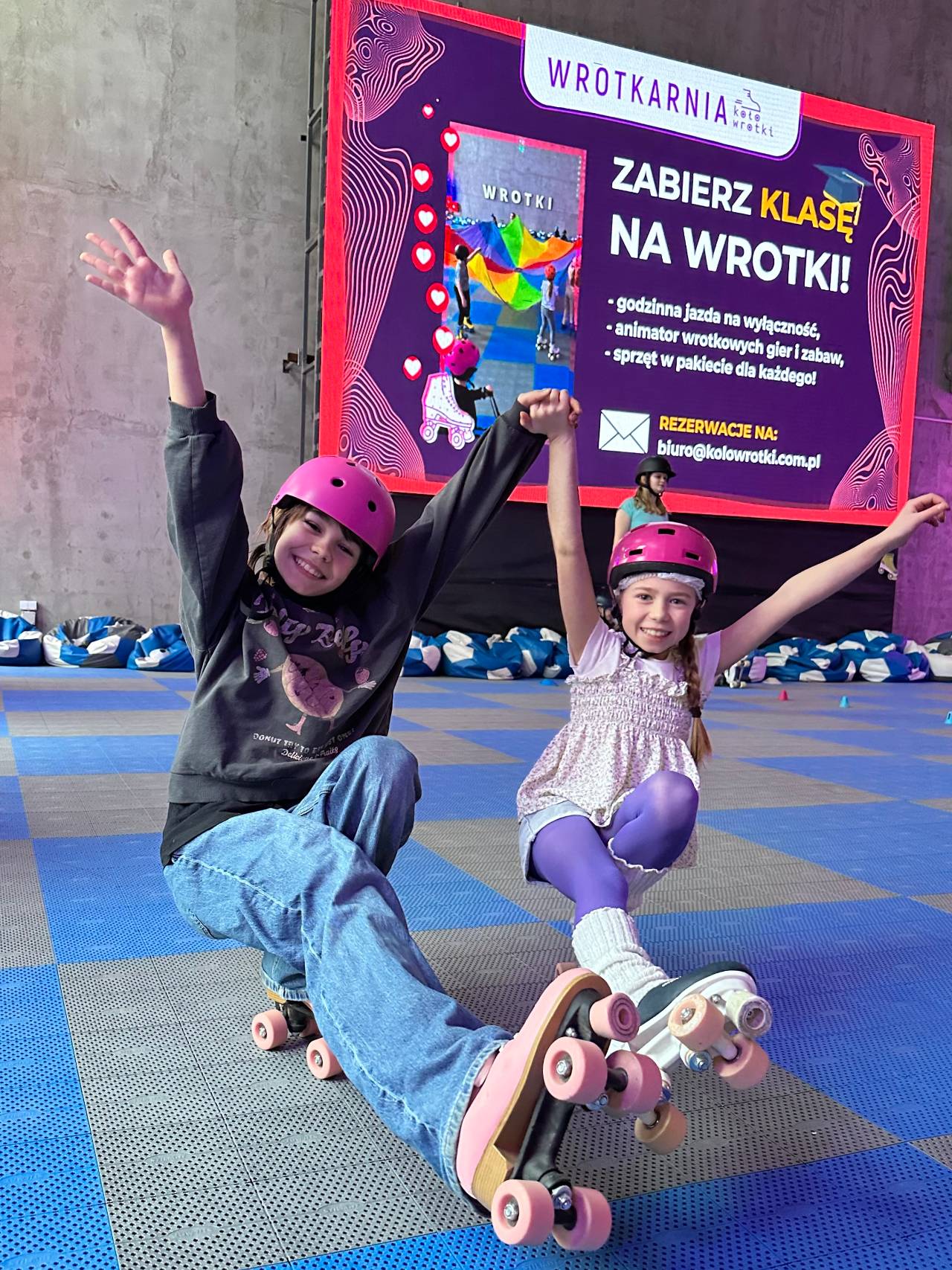 KołoWrotki to wyjątkowa wrotkarnia i wypożyczalnia sprzętu w samym sercu Łodzi. Oferujemy wrotki w rozmiarach od 26 do 47, dzięki czemu pojeżdżą u nas zarówno dzieci, jak i dorośli. Dla klientów indywidualnych nie obowiązują tury wejścia ani wcześniejsze rezerwacje — możesz przyjść o dowolnej porze w godzinach otwarcia.