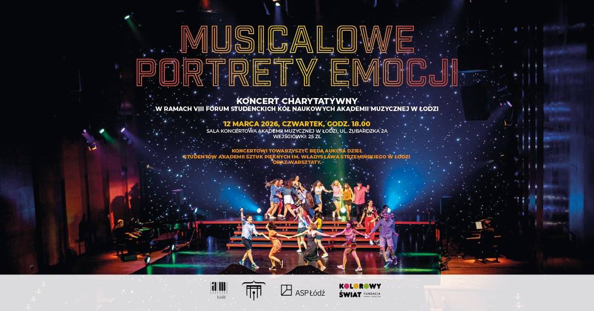 W koncercie „Musicalowe portrety emocji” największe hity gatunku łączą się z charytatywną energią. Nośnikiem emocji jest przede wszystkim muzyka napisana przez kompozytorów i aranżerów, studentów Akademii Muzycznej w Łodzi i wykonana przez ich kolegów z wydziałów Wykonawstwa Instrumentalnego, Jazzu i Muzyki Estradowej oraz wokalistów z Musicalowego Koła Naukowego „Śliska Błyskawica”. Wydarzenie jest świetną okazją do wsparcia działalności fundacji „Kolorowy Świat” w ramach aukcji charytatywnej z dziełami studentów Akademii Sztuk Pięknych w Łodzi. W przerwie koncertu publiczność zyska również atrakcyjną możliwość wglądu w proces przygotowania podobnego wydarzenia artystycznego „od kuchni”.
