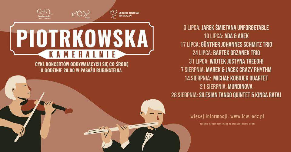 Przez całe wakacje, co środę o godz. 20:00, Pasaż Rubinsteina rozbrzmiewać będzie doskonałą muzyką na żywo. Walorami wydarzenia jest możliwość bliskiego spotkania z muzyką, która zwykle zamknięta jest w salach koncertowych. Pojawienie się muzyków w przestrzeni miejskiego zieleńca nadaje pasażowi przy ul. Piotrkowskiej nowej funkcji i sprawia, że repertuar starannie wyselekcjonowanych zespołów dostępny jest każdemu.